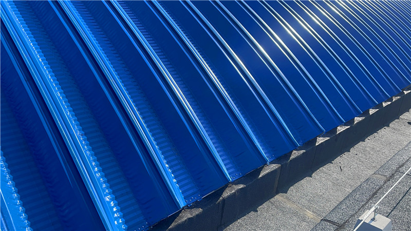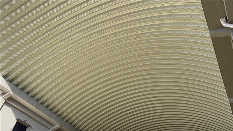 本次拱形波紋鋼屋面采用914-610型結構,拱跨18.10米,長度85.82米,總覆蓋面積超1500㎡。屋面選用冠洲品牌彩涂卷,厚度1.0mm,正面海藍色、背面灰白色,兼顧耐腐蝕性視覺協調性