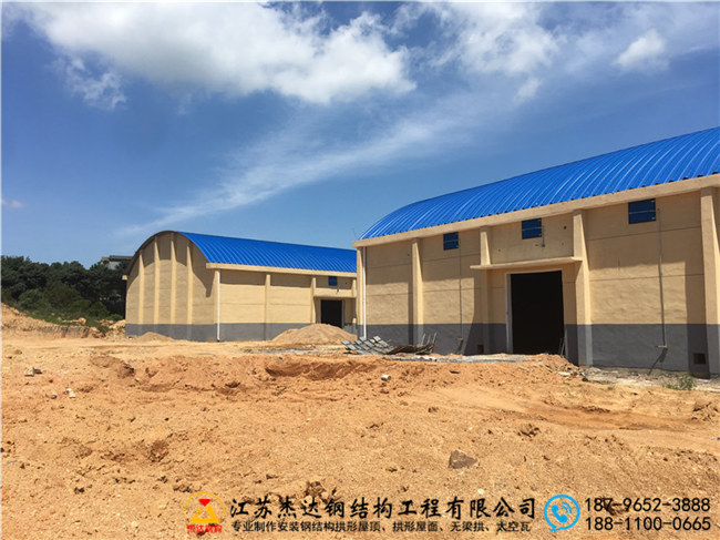 拱形屋頂設計在跨度和長度上經過精準計算,能夠有效承受外部風壓和自重。螺紋鋼的采用增強了屋頂的整體穩定性,托板和彩涂卷板的合理搭配進一步提升了抗腐蝕性能和使用壽命。