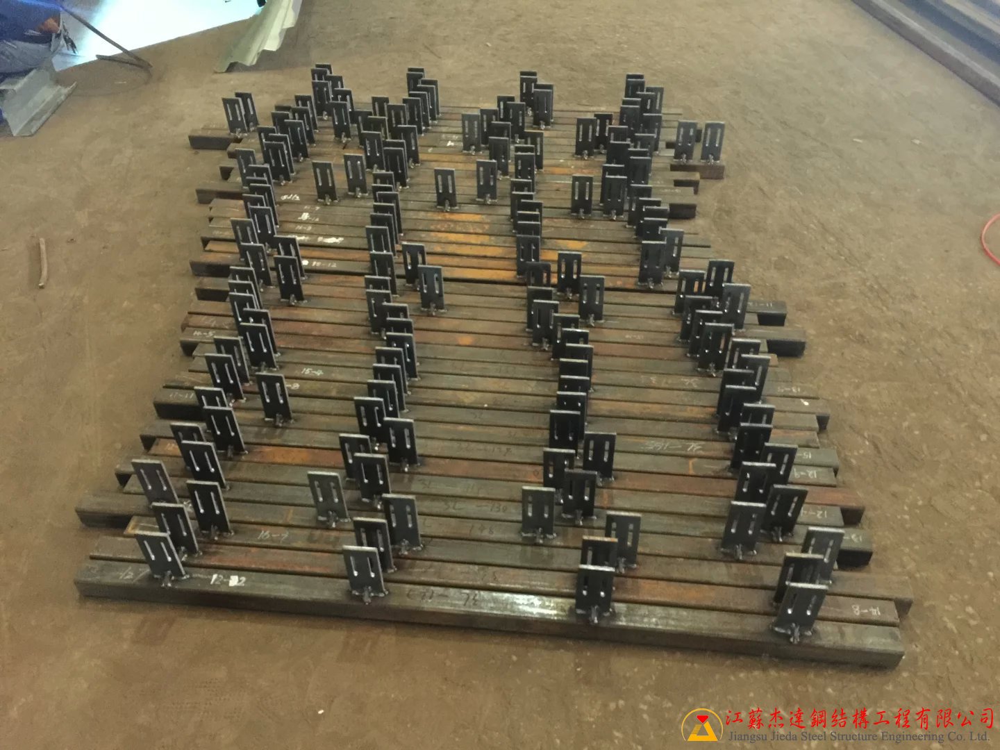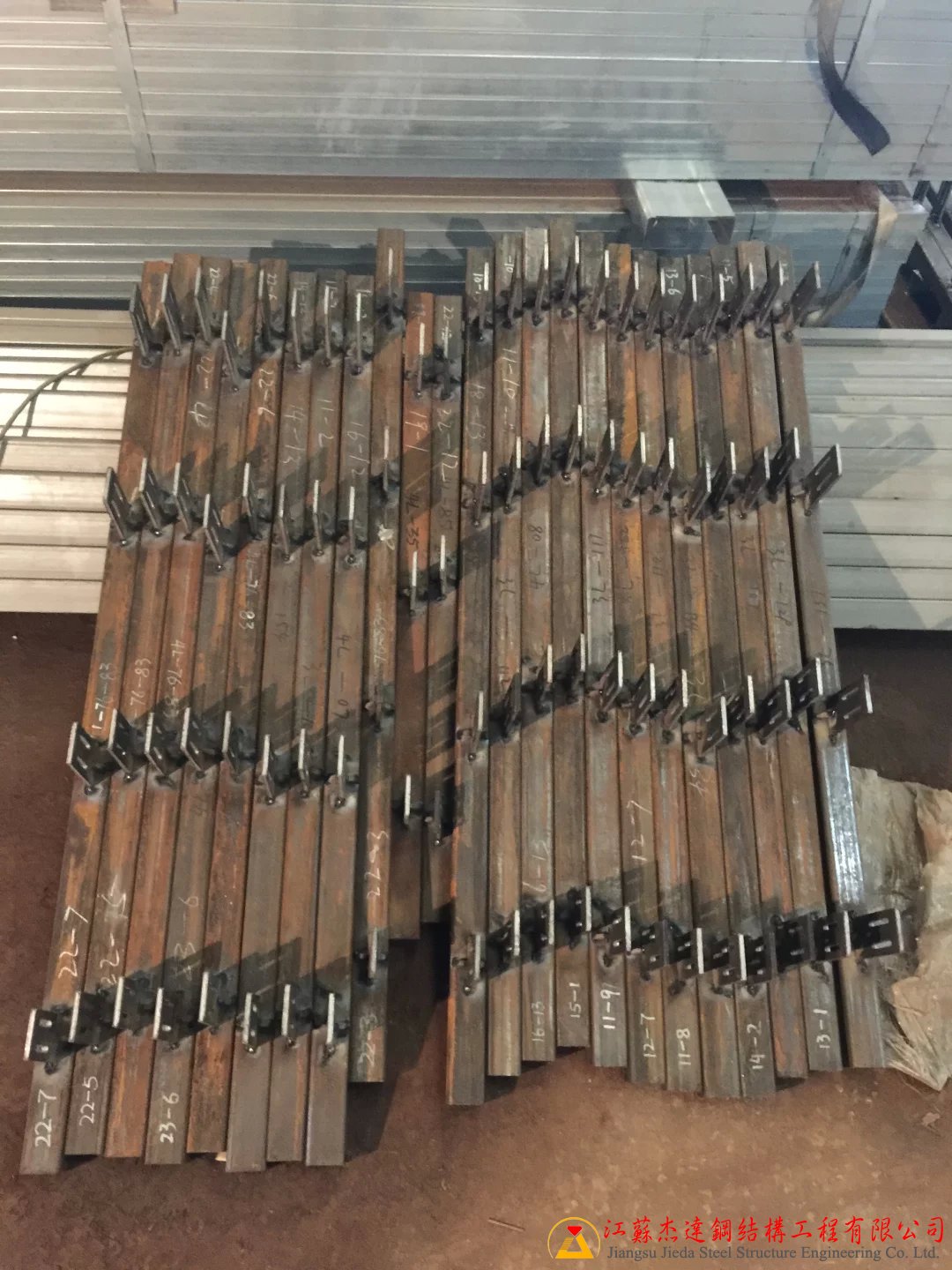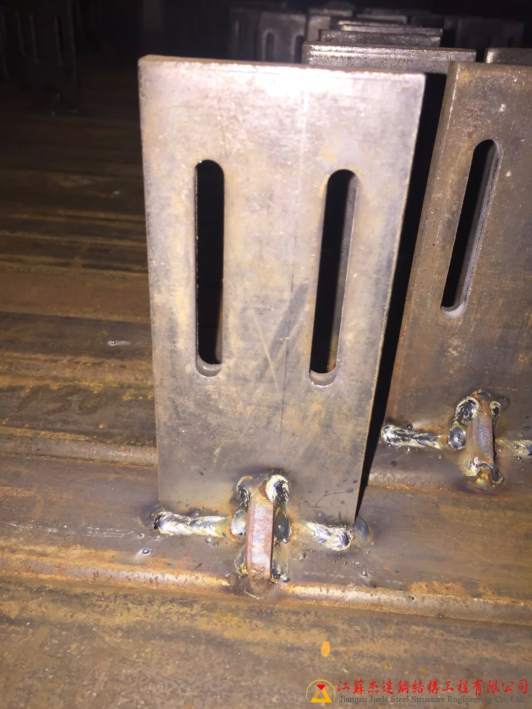 立柱先連接好連接件,再將連接件(鐵碼)點焊在預埋鋼板上,然后調整位置。立柱的垂直度可由吊錘控制,位置高度準確后,才能將牛腿正式焊在預埋件上。