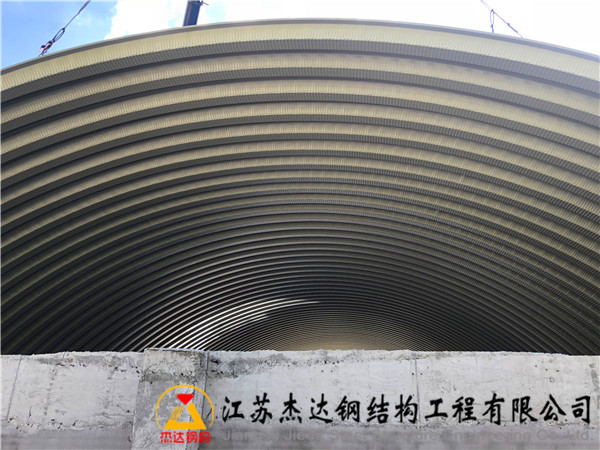 完工后的拱形波紋鋼屋蓋呈現(xiàn)出流暢的曲線與結(jié)構(gòu)穩(wěn)定性。矢跨比和拱高的比例設(shè)計保證了屋頂?shù)某休d能力與美觀性。